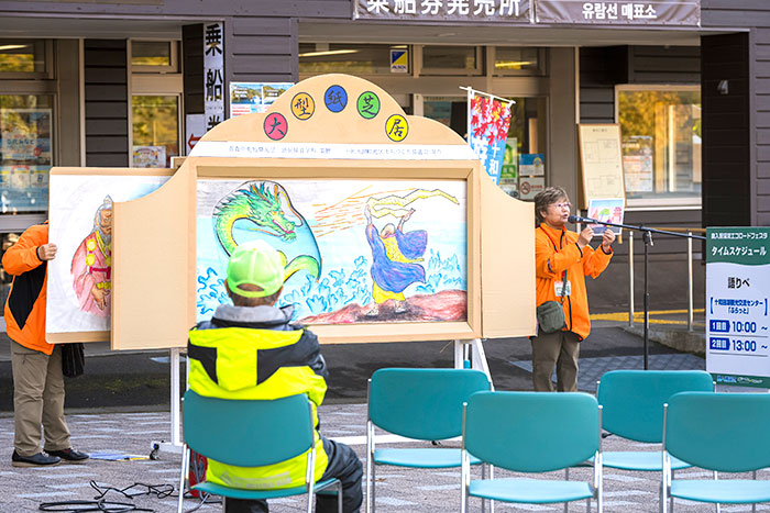 手描きの大型紙芝居を用いて、『十和田湖伝説』を伝承するプログラム