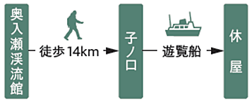 奥入瀬渓流館~奥入瀬渓流~子ノ口=十和田湖遊覧船=休屋(ゴール)