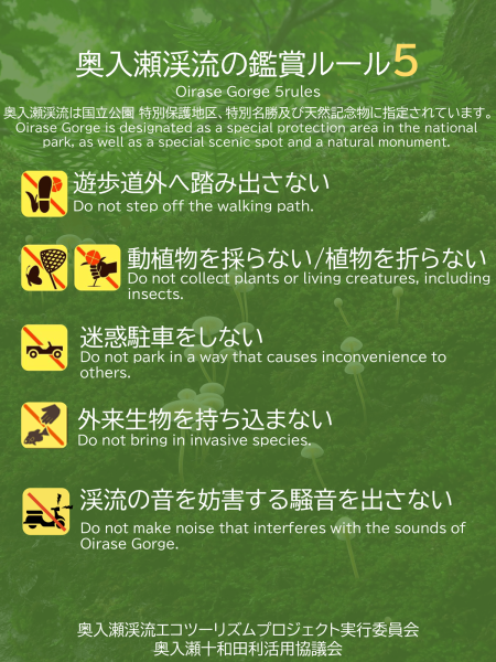 현 상태에 영향을 주지 않는 이용을 합시다※오이라세 계류는 국립 공원의 특별 보호 지구이자 특별 명승·천연기념물, 국유림의 자연 유지 타입으로, 엄정한 보호가 이루어지고 있습니다. 오이라세 계류의 훌륭한 자연환경을 다음 세대에 물려주기 위해 이해 및 협력을 부탁드립니다.